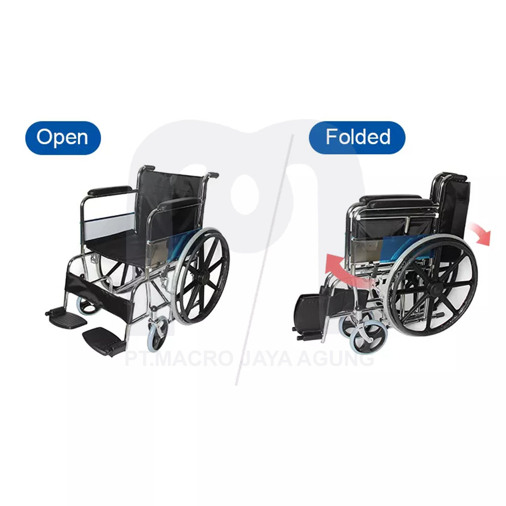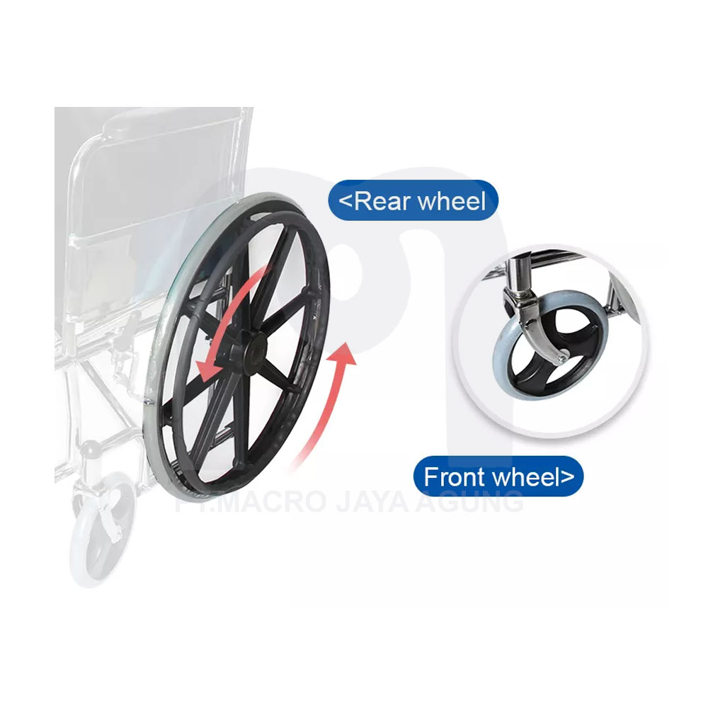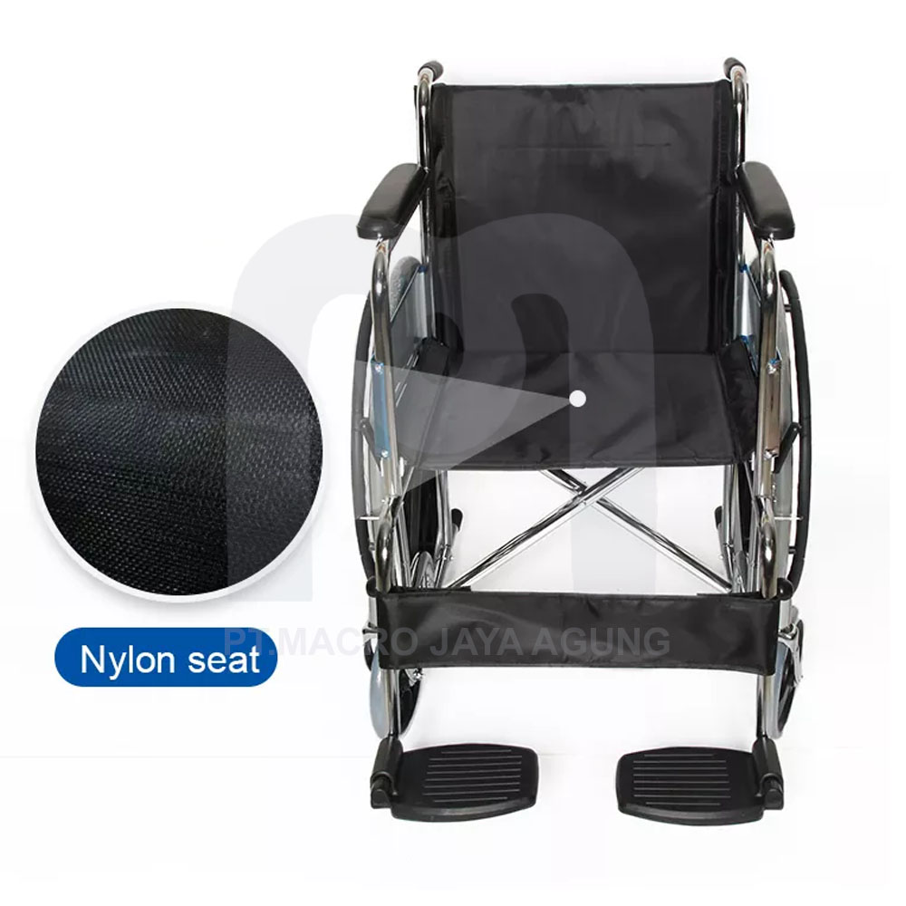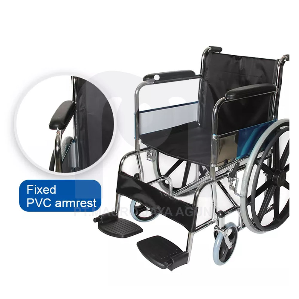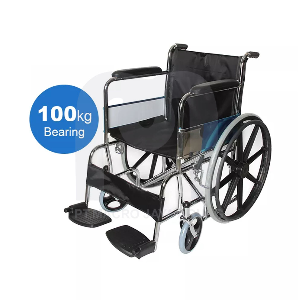 Tipe ini umum beredar di fasilitas pelayanan kesehatan, rumah sakit atau perorangan. Berbahan rangka pipa besi chrome, dengan castor PVC 8" dan ban solid 24"velg racing, tatakan kaki statis, rangka kuat dan tahan untuk berat ideal orang dewasa.